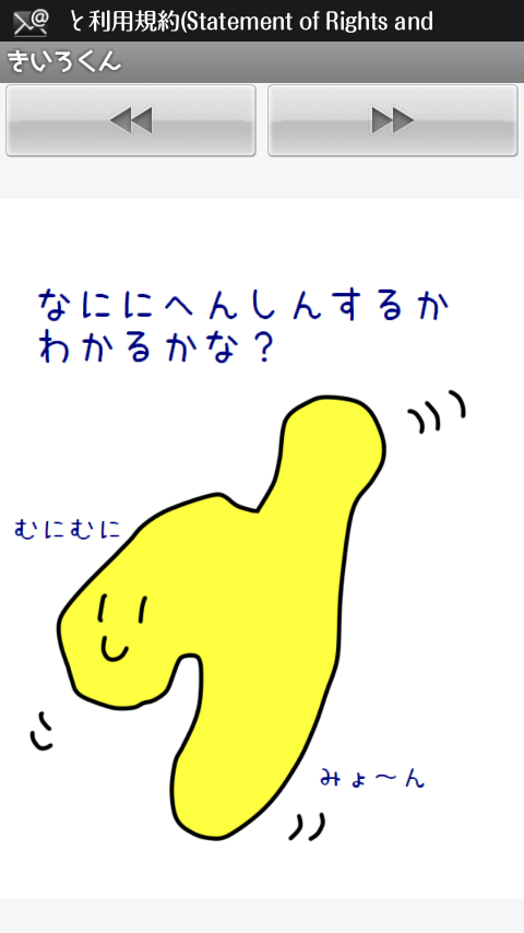 1歳前後の幼児を対象にした、シンプルな絵本です。 「きいろくん」がぐにゃぐにゃと形を変えて、いろんなものに変身! 次はなにかな、なにかな?と当てっこ遊びを楽しんでください。